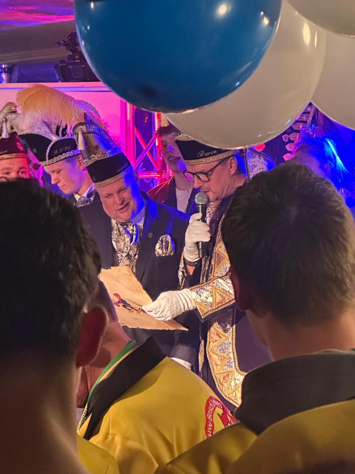 Buiten kende het programma plotseling een verrassende wending, toen duidelijk werd waarom burgemeester Patrick Welman met zijn ipad de beide wethouders vergezelde. Scherpe ogen met kennis van zaken hadden al iets kunnen weten nadat ze Simone Huizer van de gemeente Oldenzaal met een draagtasje hadden zien aankomen. Maar de persoon in kwestie – Felix Nijland – had niets door, tot het moment dat hij op de podiumvloer werd geroepen. Volkomen verrast en zelfs lichtelijk overdonderd hoorde hij hoe burgemeester Welman vertelde dat het ‘Zijne Majesteit had behaagd Felix Nijland te benoemen tot Ridder in de Orde van Oranje Nassau.’ Dit voor zijn jarenlange verdiensten in Oldenzaal, soms ver daarbuiten en met name zijn inzet op sportief, sociaaal-maatschappelijk en nu met de koepel ook op cultureel gebied – in zijn geliefde wijk Zuid-Berghuizen.