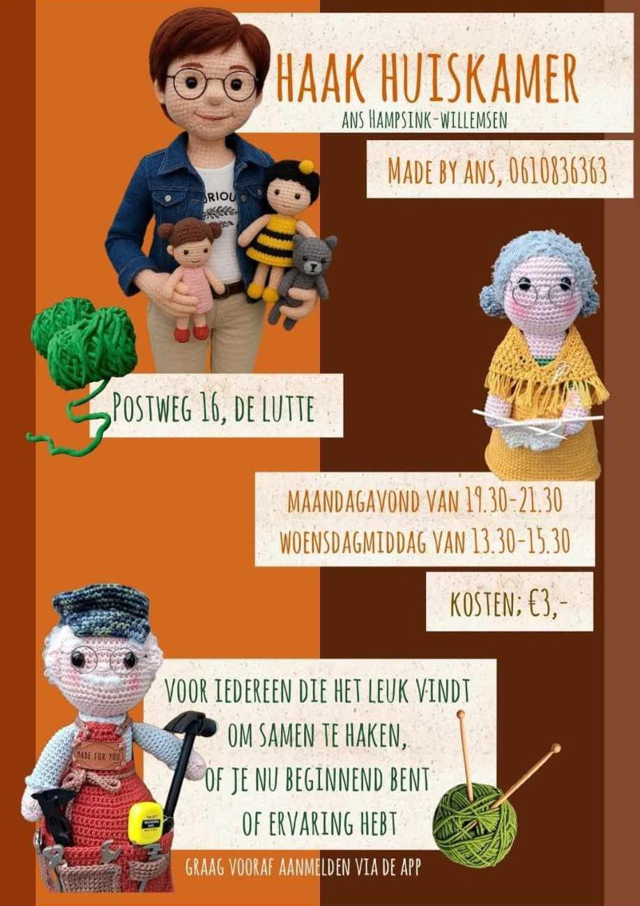 Ans Hampsink-Willemsen begint in haar woning aan de Postweg niet ver van het Lossers Voetpad met een gezellige huiskamer, waar haakliefhebbers twee keer in de week samen hun hobby kunnen beoefenen.