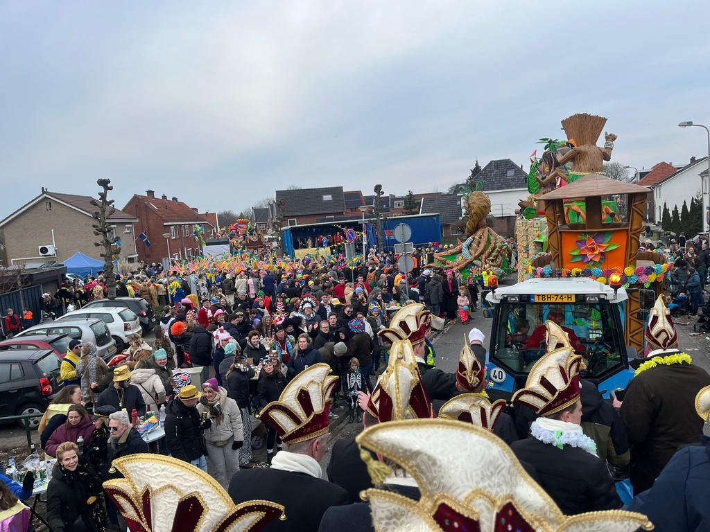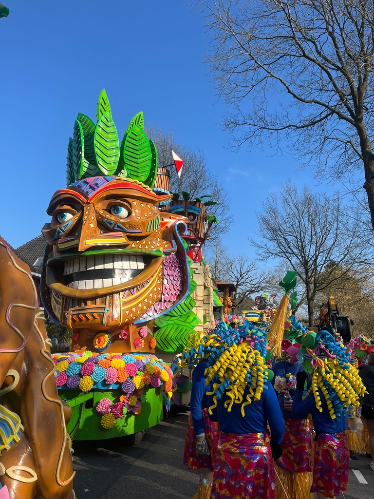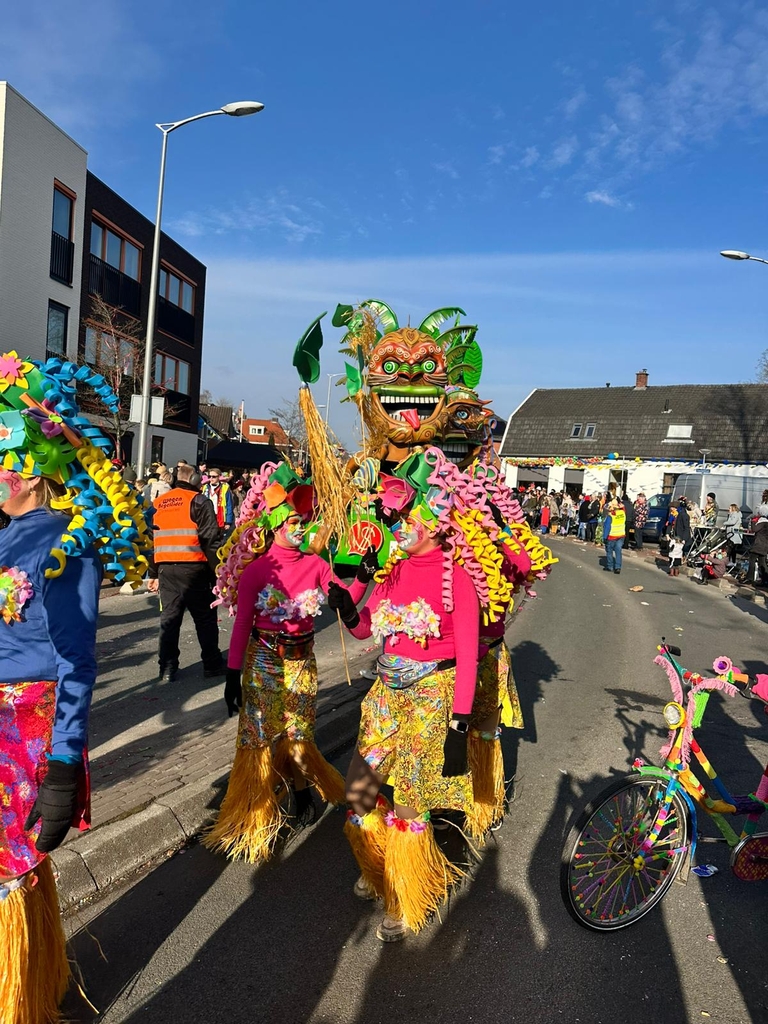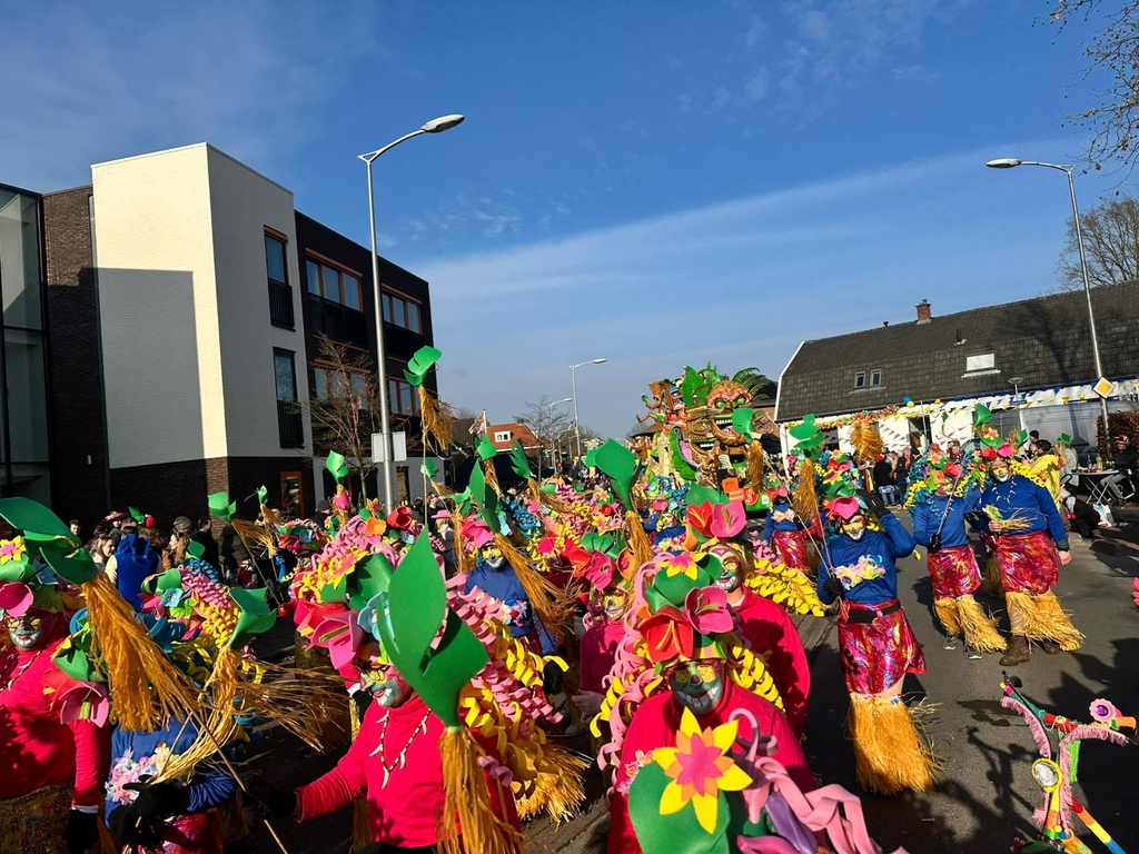 Vanuit de zonovergoten grote Twentse carnavalsoptocht in Oldenzaal: O.C.V. De Spanvöggel uit Zuid-Berghuizen is van de partij.
