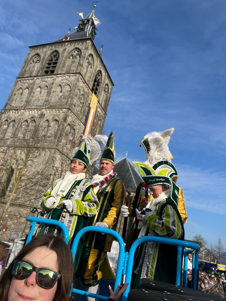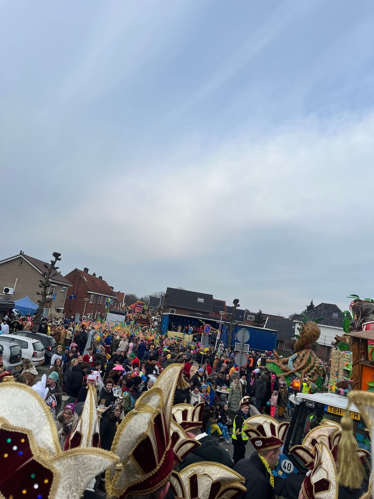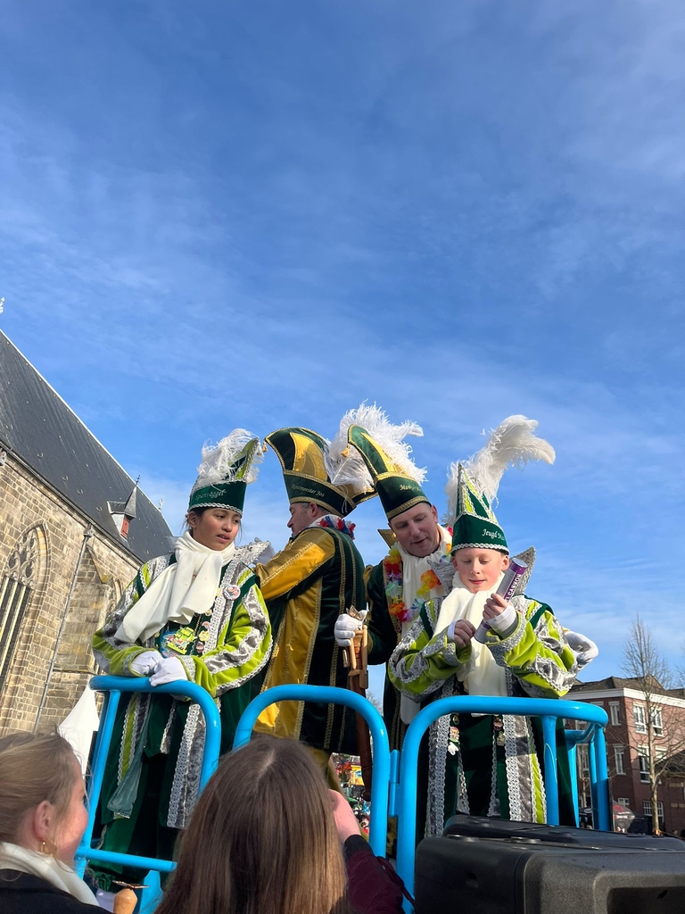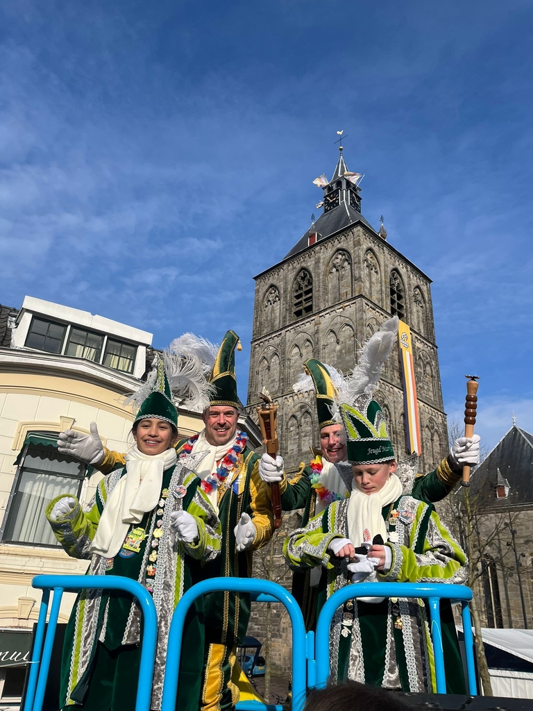 Vanuit de zonovergoten grote Twentse carnavalsoptocht in Oldenzaal: O.C.V. De Spanvöggel uit Zuid-Berghuizen is van de partij.