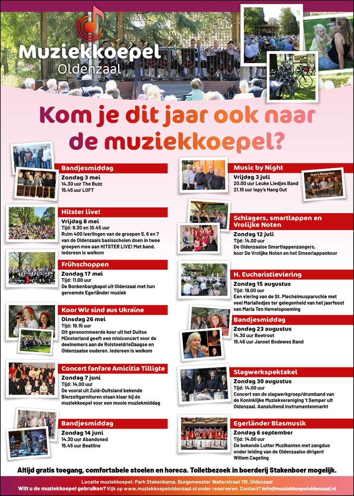 Het muziekkoepelseizoen 2026 wordt zondag 3 mei geopend met twee energieke bands, die het publiek in Park Stakenkamp zullen trakteren op de mooiste pop- en rocknummers uit de memorabele jaren ’60 en ’70.